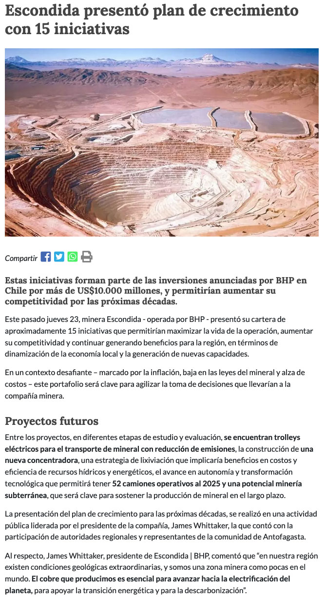 Escondida | BHP presentó plan de crecimiento con anuncio de nuevos proyectos mineros - (coweb.cl)