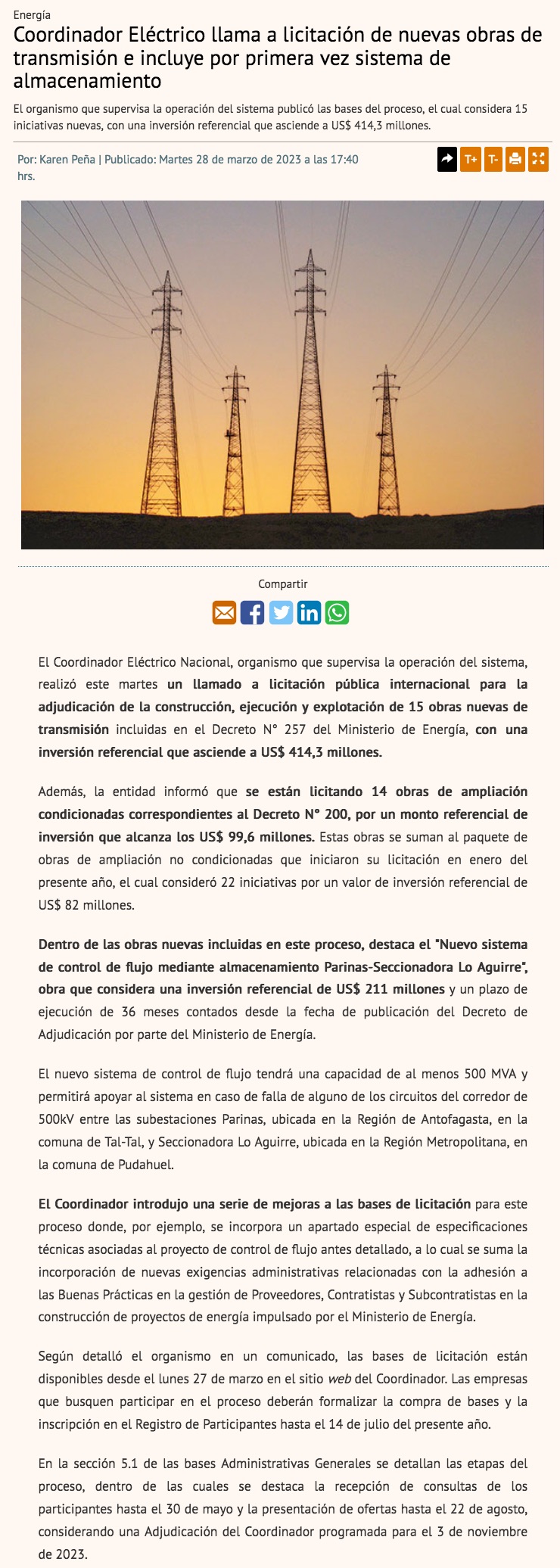 Chile impulsa licitación de 15 proyectos de transmisión eléctrica por US$ 414 millones - (bloomberglinea.com)