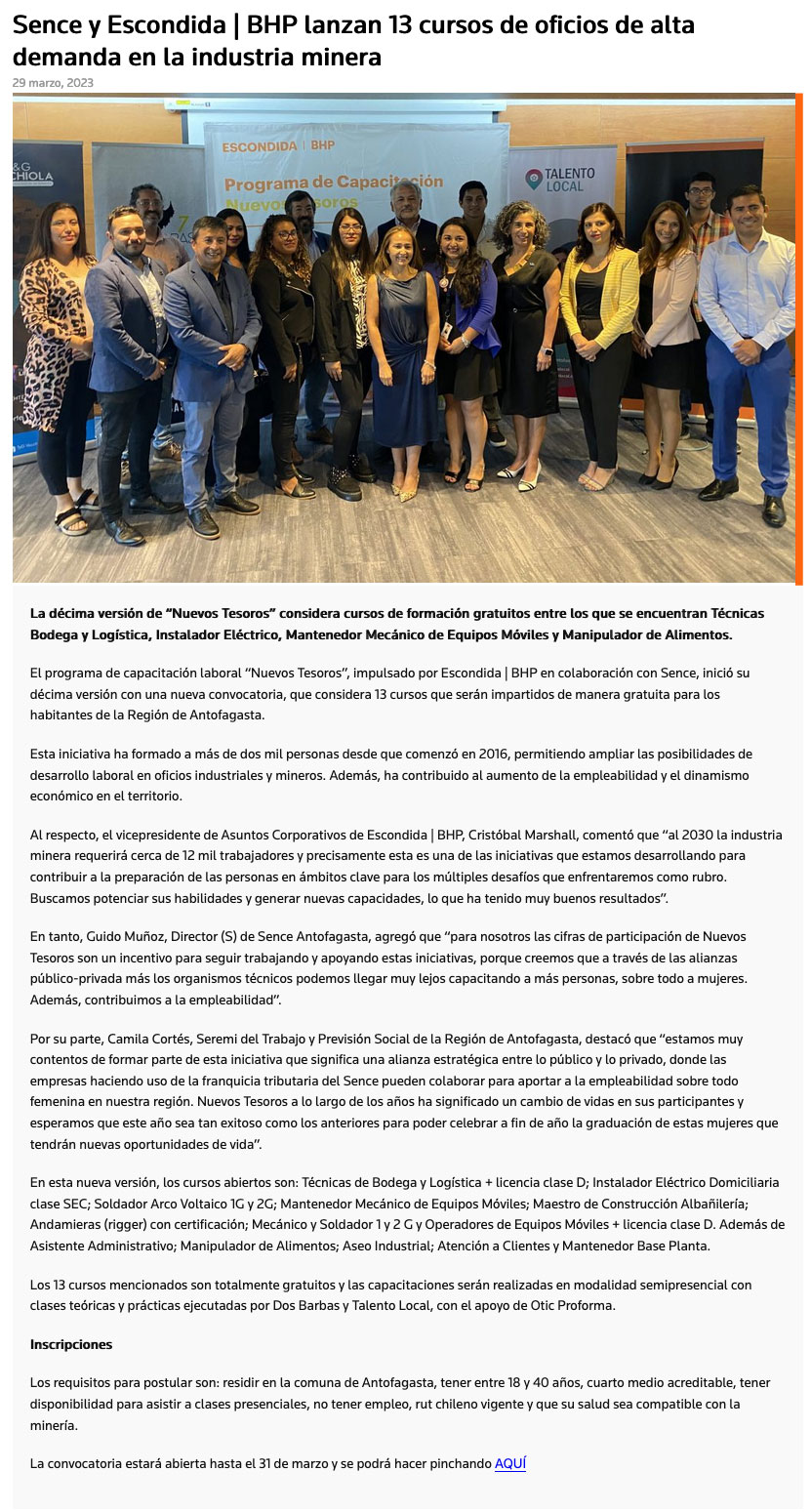 Sence y Escondida | BHP lanzan 13 cursos de oficios de alta demanda en la minería - (norteminero online)