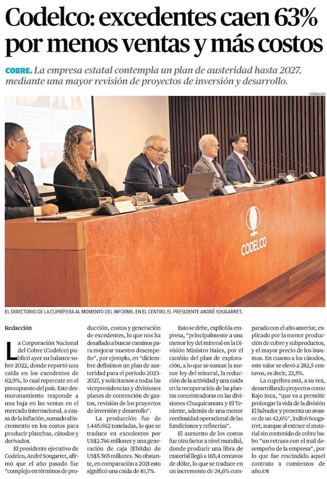 Se desploman excedentes de Codelco y producción seguirá cayendo en 2023 - (El Mercurio de Santiago)