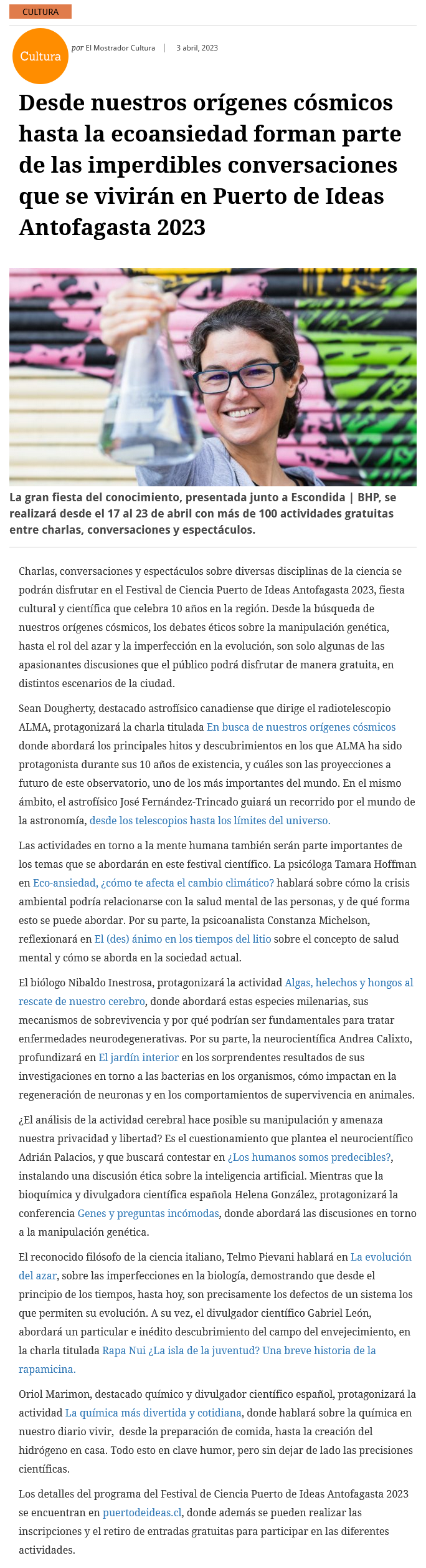 Desde nuestros orígenes cósmicos hasta la ecoansiedad forman parte de las imperdibles conversaciones que se vivirán en Puerto de Ideas Antofagasta 2023 - (artenorte.cl)