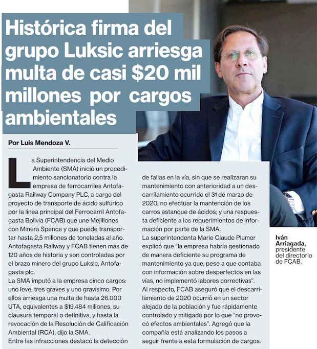 SMA formula cinco cargos contra FCAB por infracciones al transporte de ácido sulfúrico - (El Mercurio de Antofagasta)