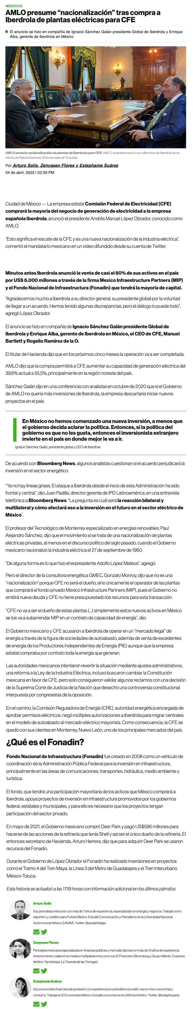 Iberdrola vende a empresa pública mexicana gran parte de su negocio y AMLO dice que es una "nueva nacionalización" - (americaeconomia online)