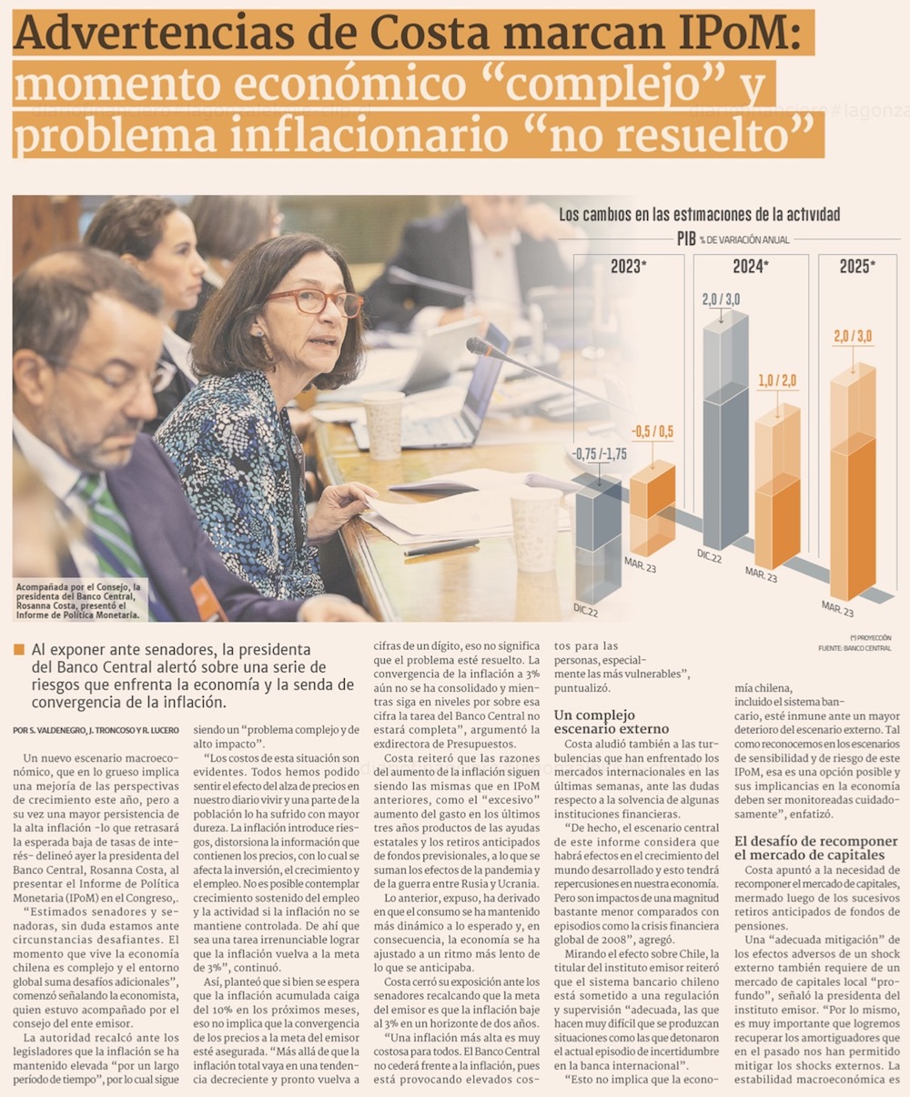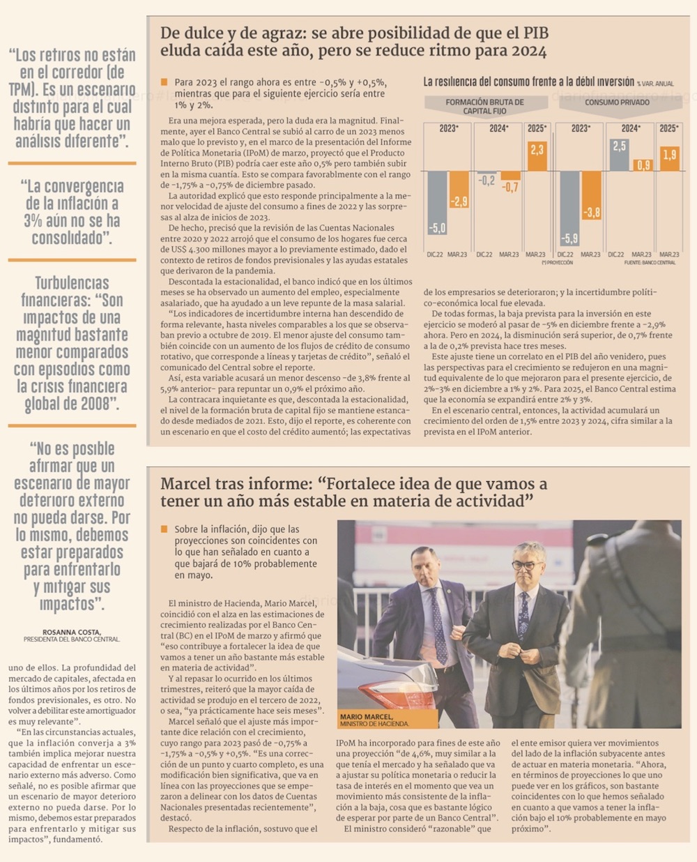 B. Central mejora cálculo del PIB, pero advierte que “problema inflacionario” no está resuelto, ni asegurado su retroceso - (El Mercurio de Santiago)