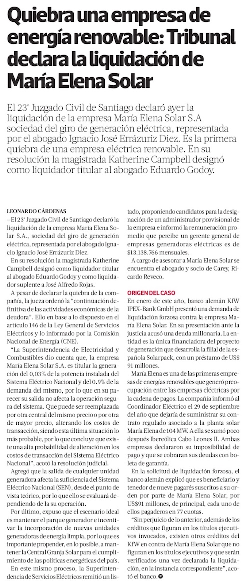 Decretan liquidación de empresa renovable - (El Mercurio de Santiago)