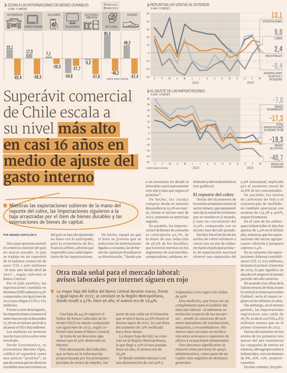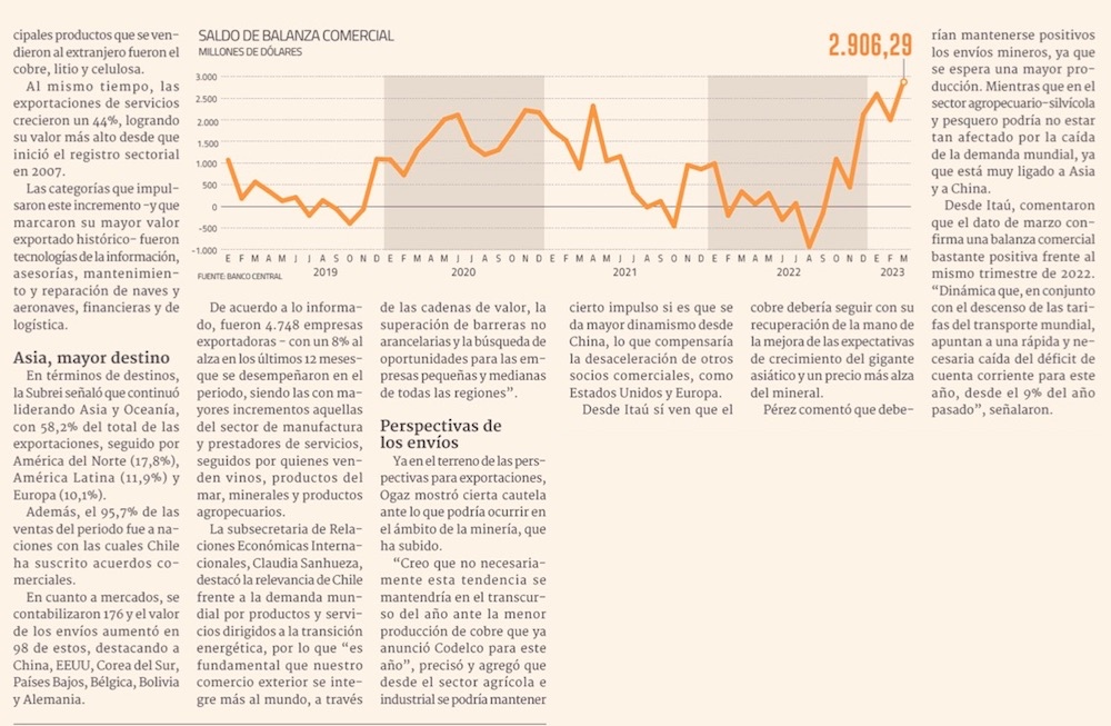 Exportaciones en marzo suman récord de casi US$ 10.000 millones por cobre y litio - (El Mercurio de Santiago)