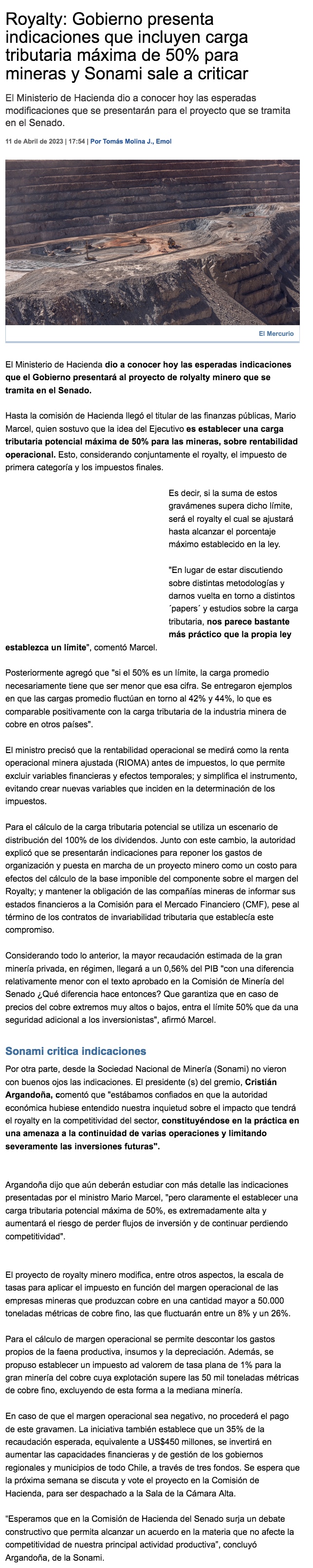 “Decepcionante”y “definitivamente excesivo”: Gremios mineros reiteran que royalty con carga máxima de 50% afectará la actividad - (Pulso Online)
