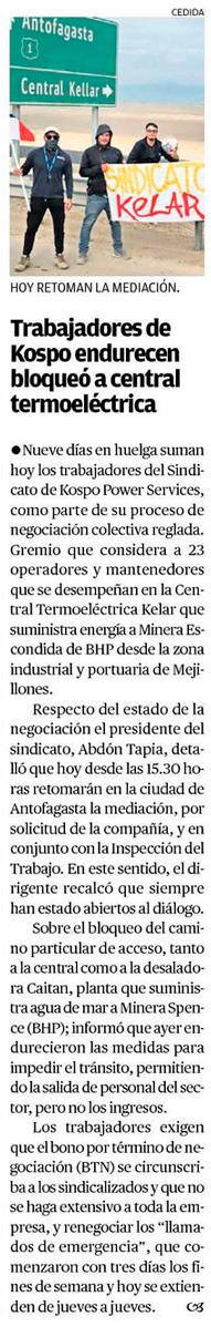 Trabajadores de Kospo endurecen bloqueó a central termoeléctrica - (El Mercurio de Antofagasta)