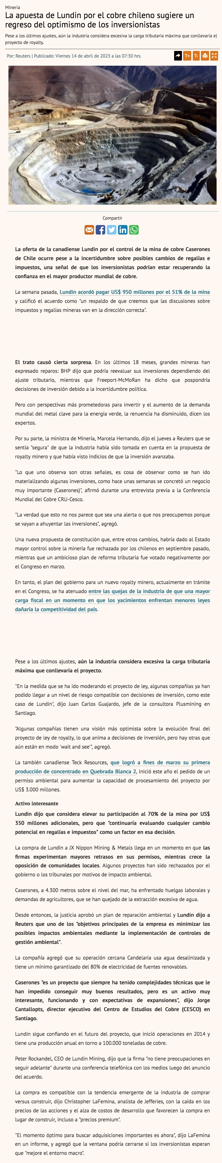 Compra de Lundin en Chile sugiere regreso de optimismo de inversionistas por la minerĂa local - (Pulso Online)