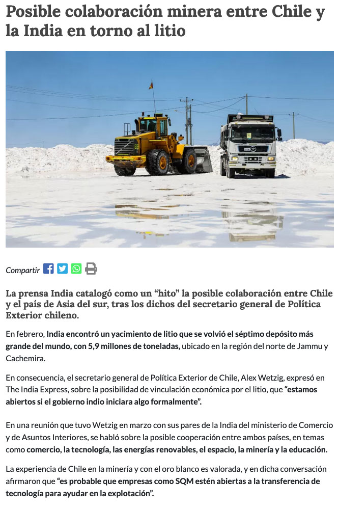 Chile “abierto” a colaborar con gobierno indio para potenciar su industria del litio - (Diario Financiero)