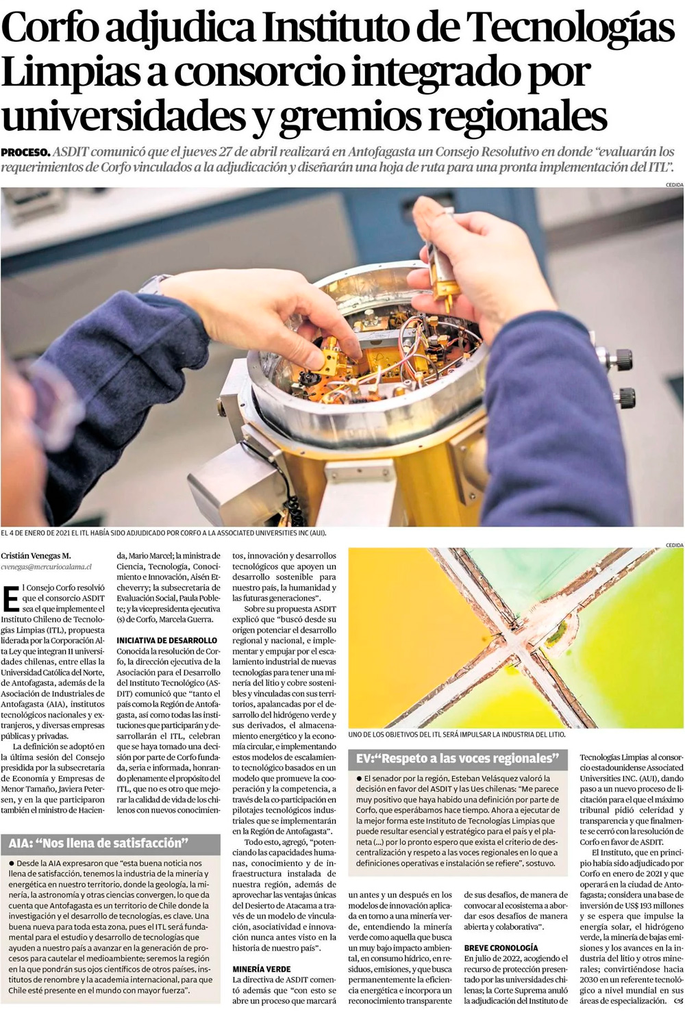 Corfo adjudicó Instituto Chileno de Tecnologías Limpias a Asdit donde participan 11 universidades - (Diario Financiero)
