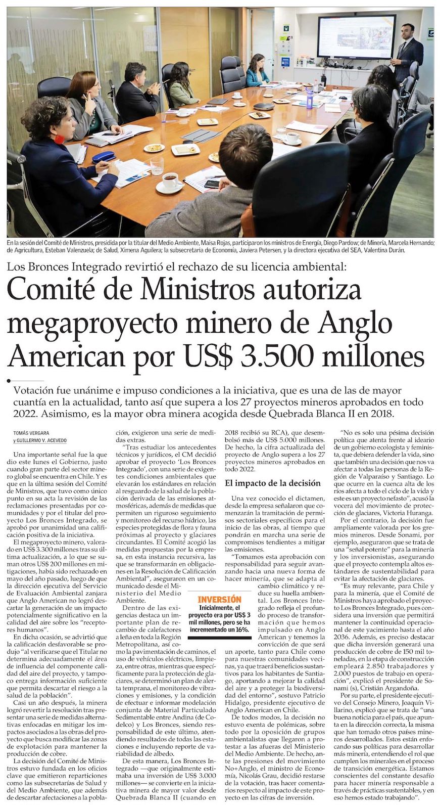 Comité de Ministros aprobó de manera unánime proyecto minero Los Bronces Integrado, pero con condiciones - (Pulso)