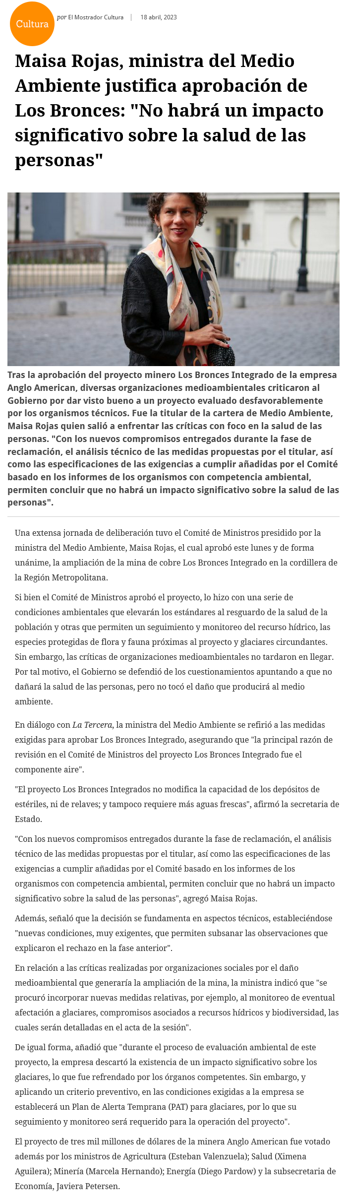 Maisa Rojas, ministra del Medio Ambiente por aprobación de Los Bronces Integrado: "No habrá un impacto significativo sobre la salud de las personas" - (Pulso)