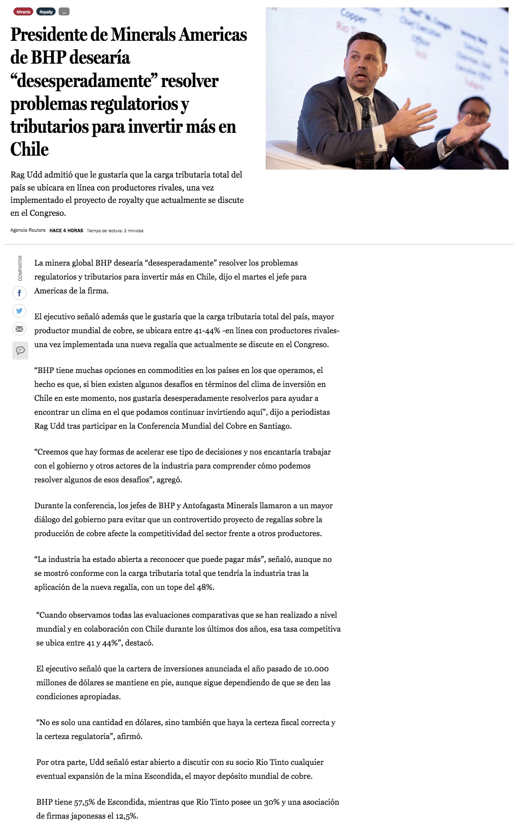 Presidente de Minerals Americas de BHP desearía "desesperadamente" resolver problemas regulatorios y tributarios para invertir más en Chile - (DF Online)