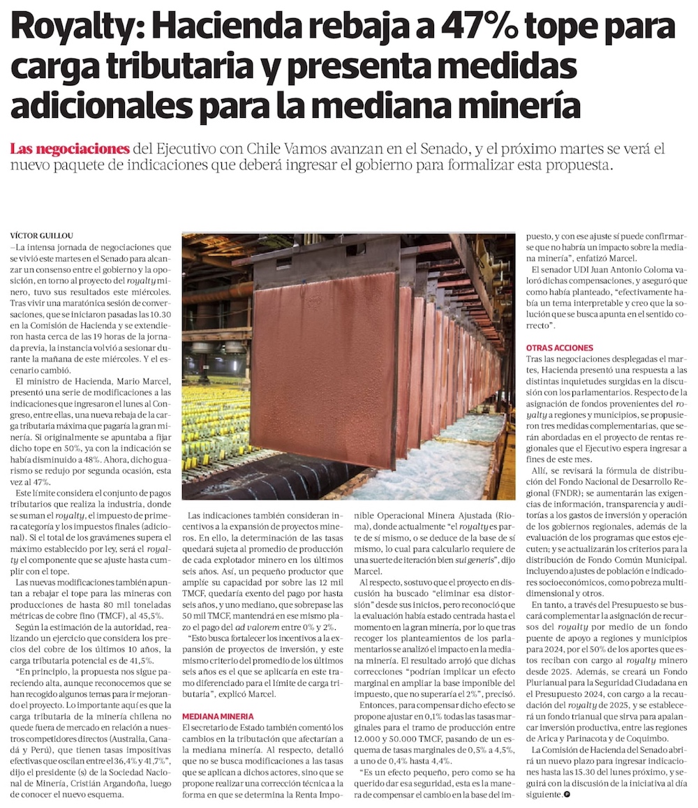 Royalty: Gobierno propone rebajar a un 47% carga tributaria para lograr acuerdo con la oposición - (Diario Financiero)