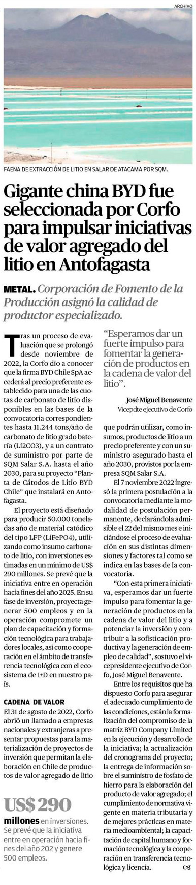 Corfo asigna a la firma china BYD cuota de litio a precio preferente - (El Mercurio de Santiago)