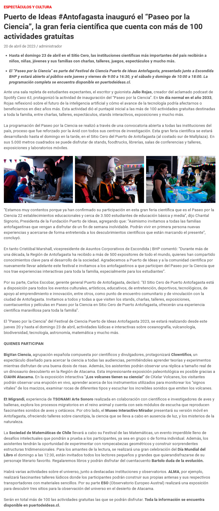 Puerto de Ideas Antofagasta inauguró el “Paseo por la Ciencia”, la gran feria científica que cuenta con más de 100 actividades gratuitas - ( artenorte.cl)