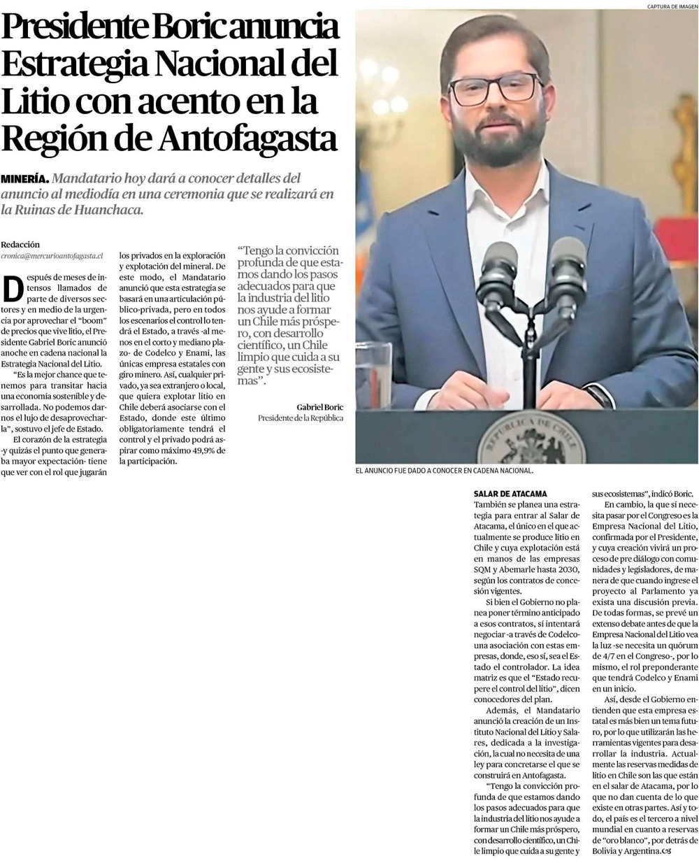 Política del Litio: Cadena nacional; se lanza en Antofagasta y se abren a negociar con SQM - (La Segunda)