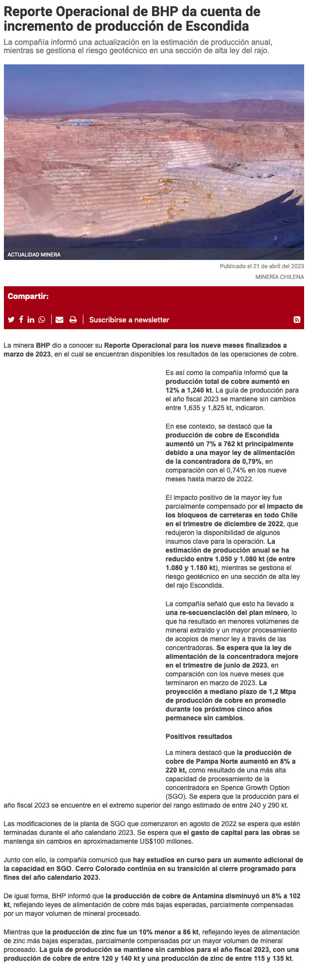 BHP produjo 1,24 millón de ton de cobre entre julio 2022 y marzo 2023 - (mineriayfuturo.cl)