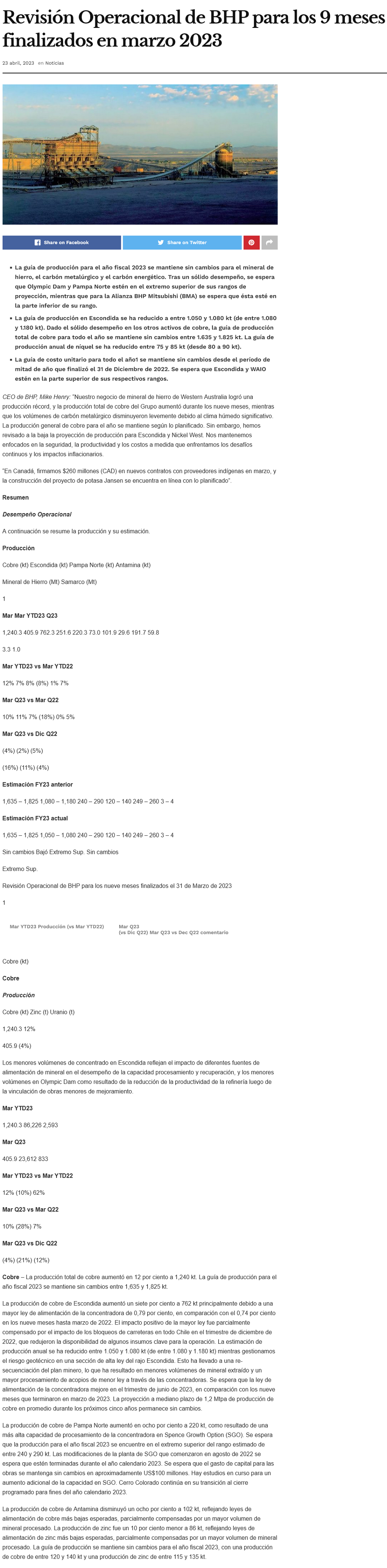 BHP produjo 1,24 millón de ton de cobre entre julio 2022 y marzo 2023 - (mineriayfuturo.cl)
