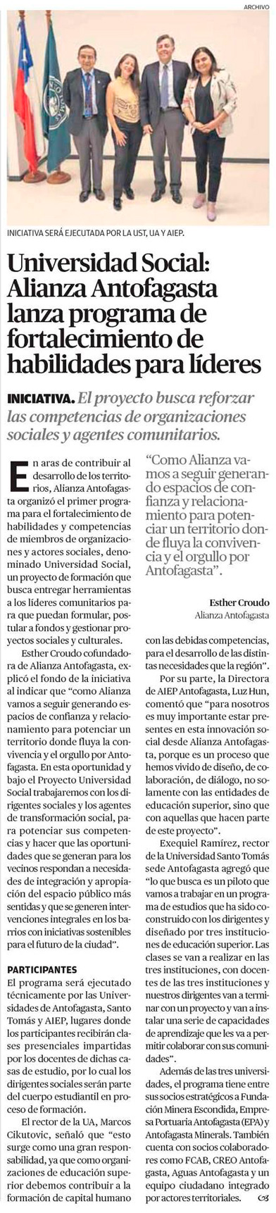Universidad Social: Alianza Antofagasta lanza programa de fortalecimiento de habilidades para lĂderes - (El Mercurio de Calama)