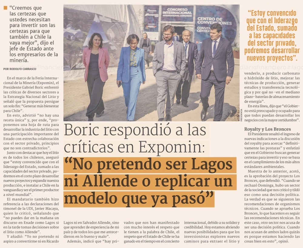 Boric modera mensaje en plan para el litio y subraya virtudes de alianza público-privada - (El Mercurio de Santiago)