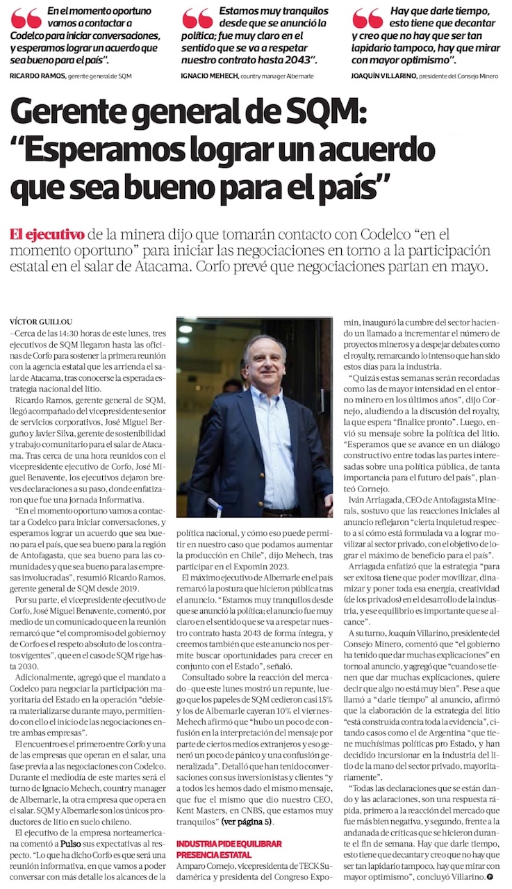 SQM tras reunión con Corfo por litio: "Esperamos lograr un acuerdo que sea bueno para el país" - (emol)
