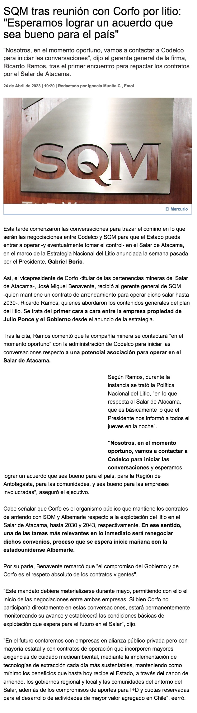 Gerente general de SQM tras reunión con Corfo: "Esperamos lograr un acuerdo bueno para el país, las comunidades y las empresas" - (DF Online)