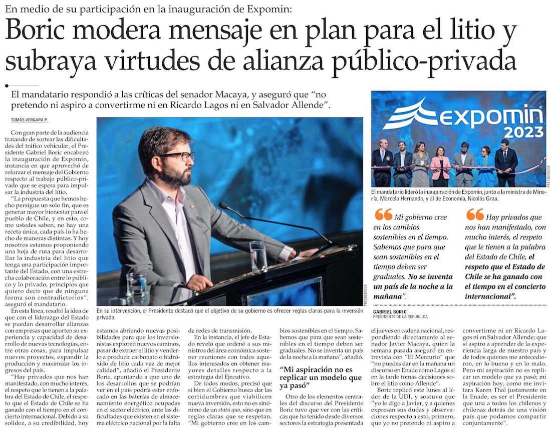 Boric respondió a las críticas en Expomin: “No pretendo ser Lagos ni Allende o replicar un modelo que ya pasó” - (Diario Financiero)