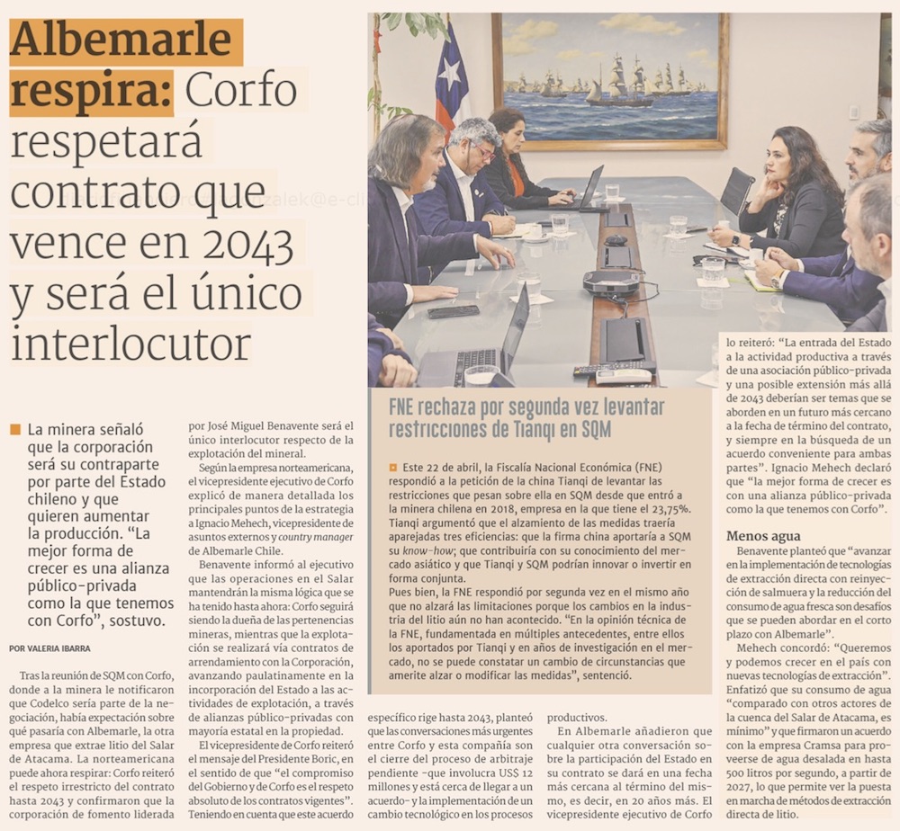 Corfo: Renegociación con Albemarle será cuando se acerque el fin de su contrato - (El Mercurio de Santiago)