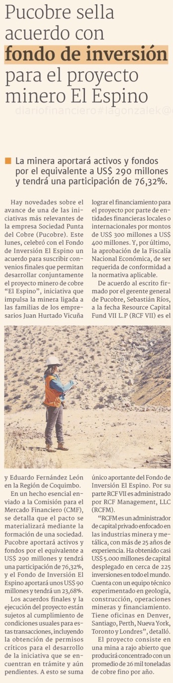 Pucobre cierra acuerdo con fondo de inversión para materializar El Espino - (El Día)