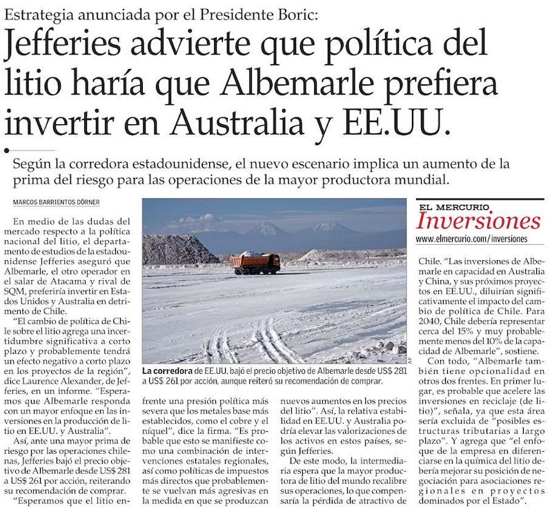 Albemarle respira: Corfo respetará contrato que vence en 2043 y será el único interlocutor - (Diario Financiero)