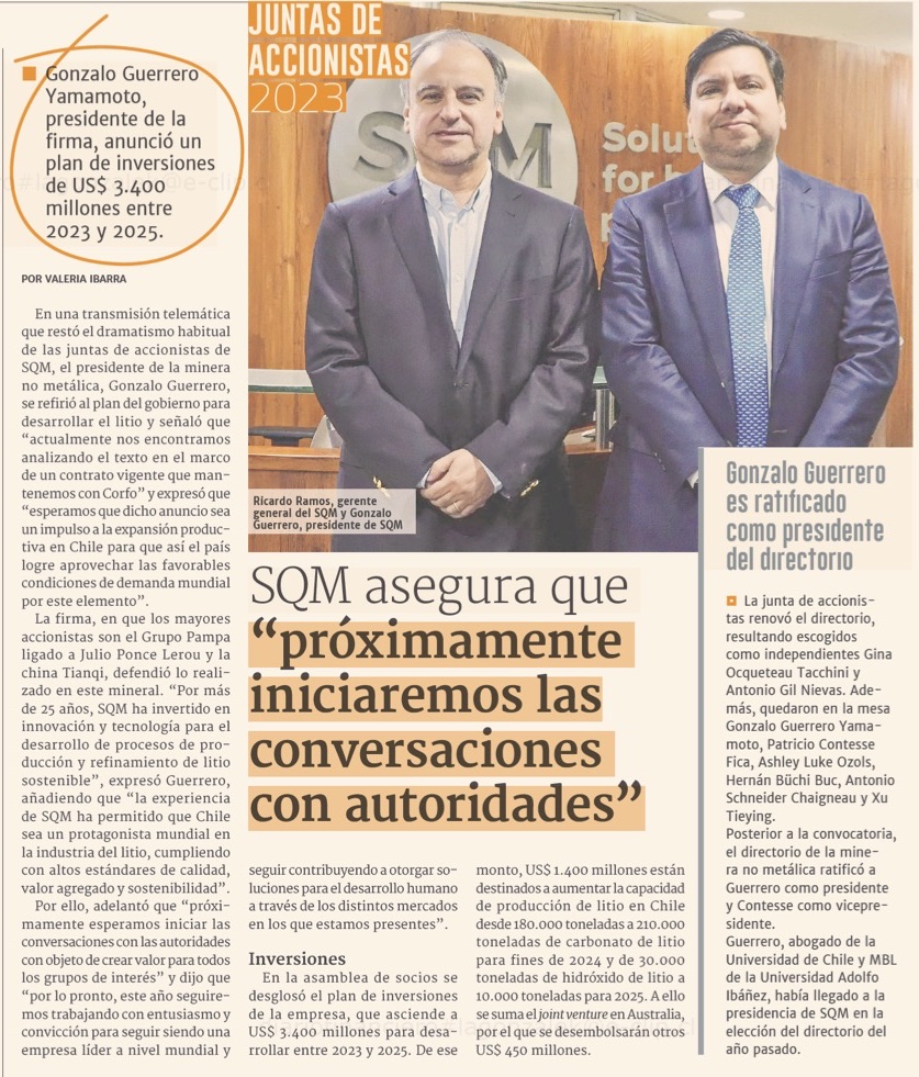 Litio: presidente de SQM afirma que esperan iniciar "próximamente" conversaciones por renegociación en el salar de Atacama - (Pulso)