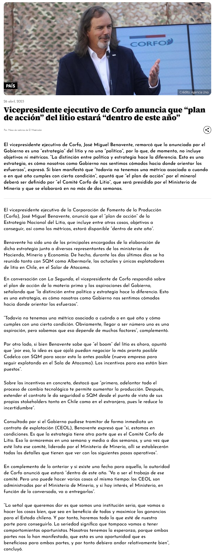 José Miguel Benavente, vicepresidente ejecutivo de Corfo: “Dentro de este año” debe estar el plan de acción de la Estrategia Nacional del Litio - (La Segunda)