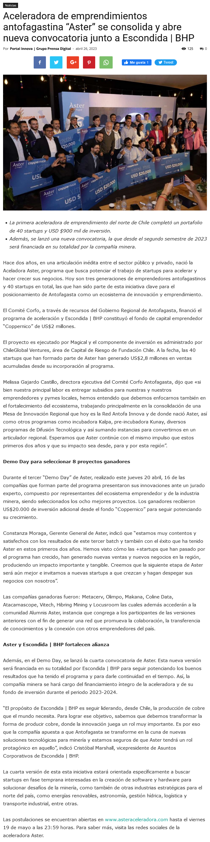 Aceleradora de emprendimientos antofagastina “Aster” se consolida y abre nueva convocatoria junto a Escondida | BHP - (infogate.cl)