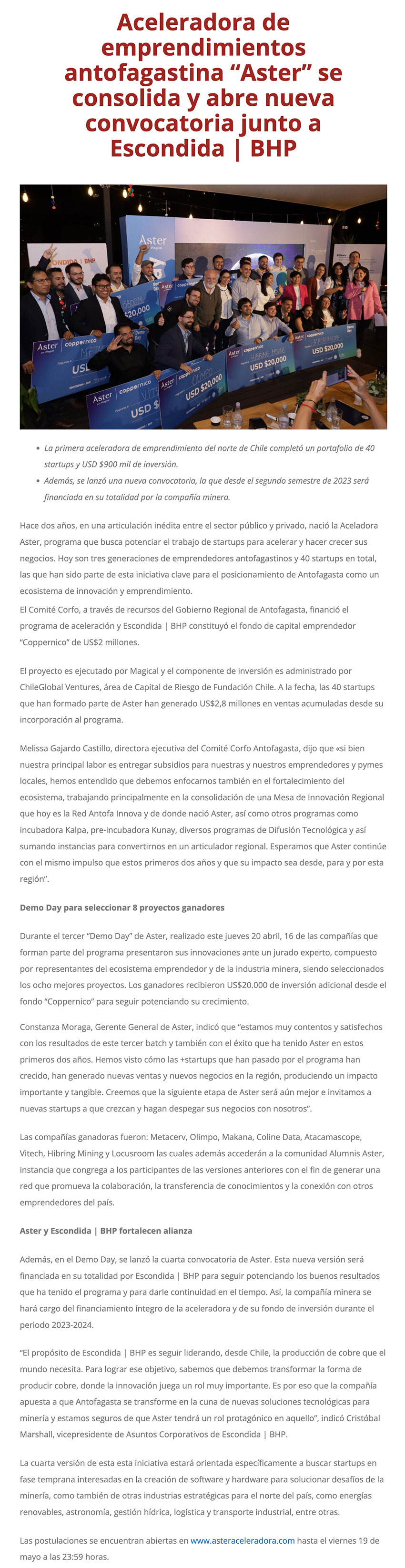 Aceleradora de emprendimientos antofagastina “Aster” se consolida y abre nueva convocatoria junto a Escondida | BHP - (infogate.cl)