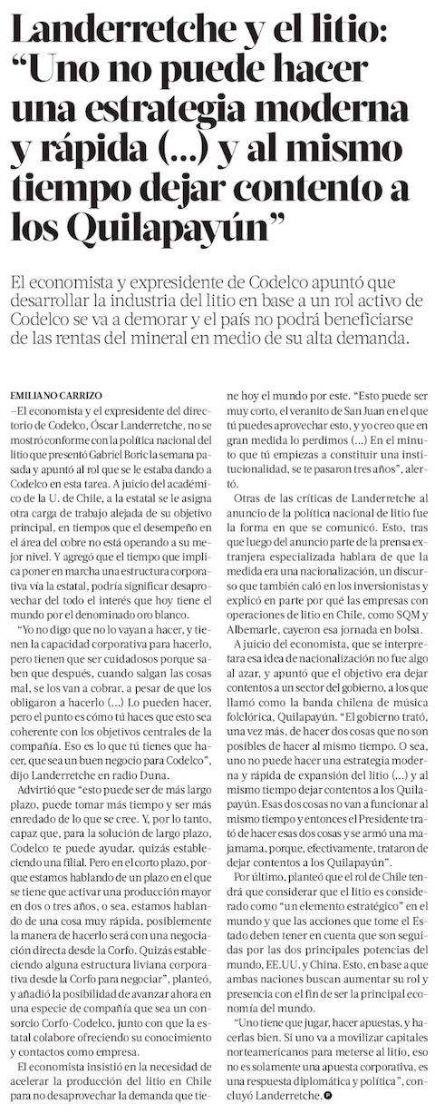 Landerretche y litio: "No se puede hacer una estrategia moderna y rápida y al mismo tiempo dejar contentos a Quilapayún" - (emol)