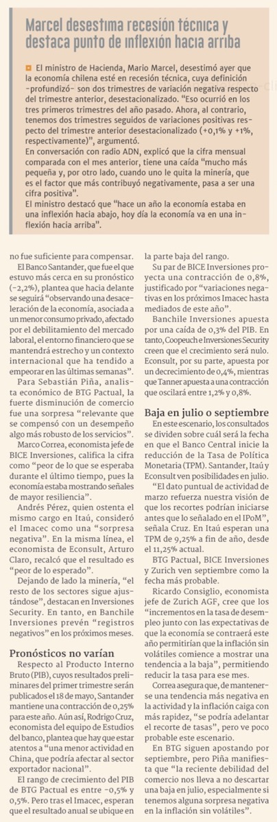 Tras negativo Imacec de marzo, la economía acumula 2 trimestres consecutivos de caída - (El Mercurio de Santiago)