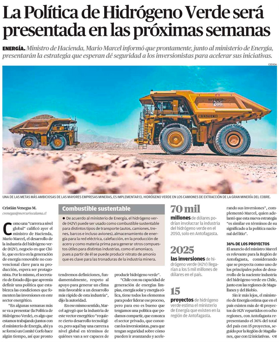 Marcel: Gobierno presentará en próximas semanas la política para el desarrollo del hidrógeno verde - (Diario Financiero)