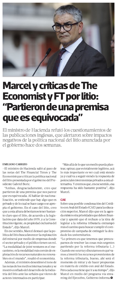 Marcel responde a críticas en medios extranjeros por estrategia del litio: “Ya hay una respuesta positiva de potenciales inversionistas privados” - (Diario Financiero)