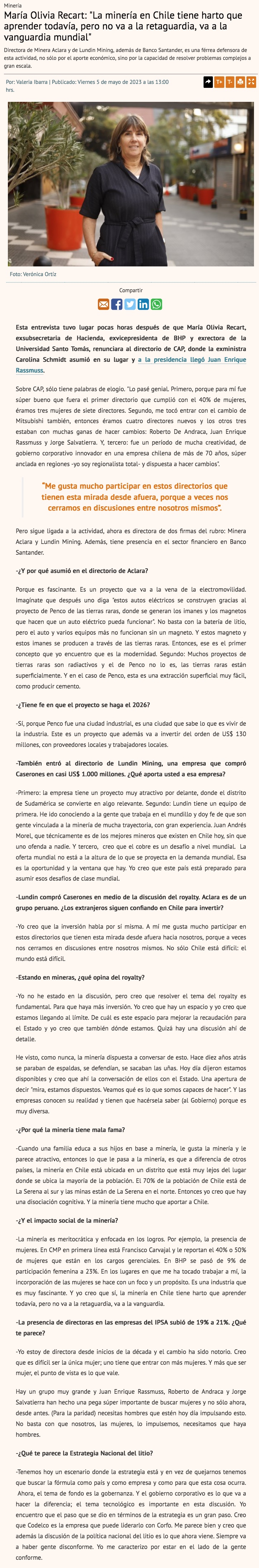 María Olivia Recart: "La minería en Chile tiene harto que aprender todavía, pero no va a la retaguardia, va a la vanguardia mundial" - (Diario Financiero)