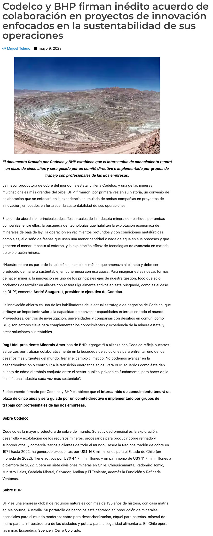 Codelco y BHP firman inédito acuerdo de innovación para el desarrollo de la minería sustentable - (chileminero.cl)