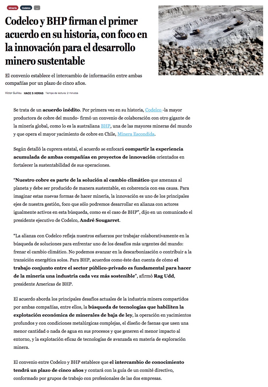 Codelco y BHP firman inédito acuerdo de innovación enfocado en desarrollo de la minería sustentable - (emol)