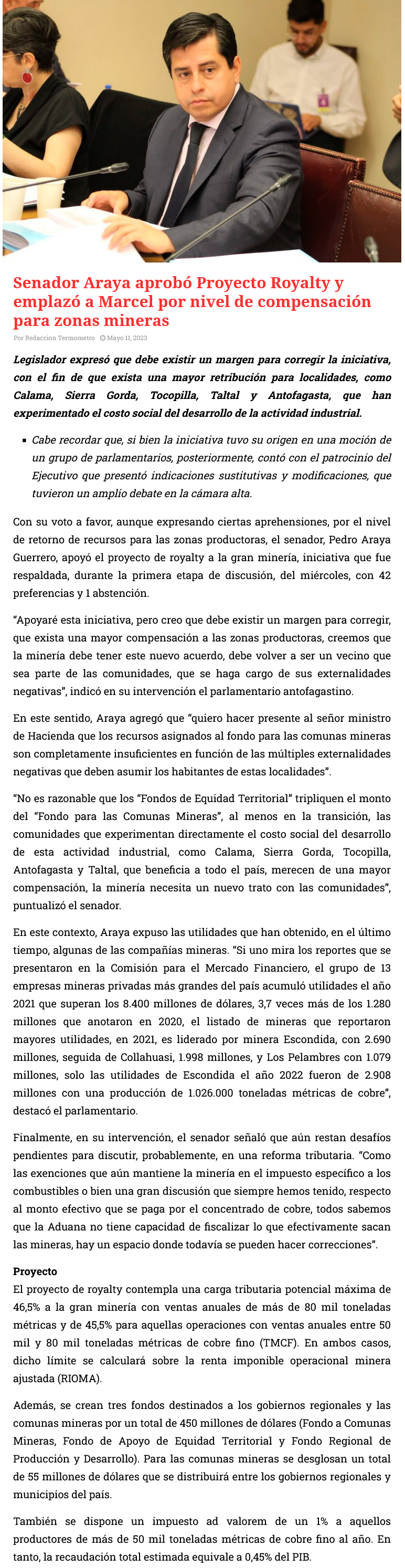 Senador Araya aprobó proyecto royalty y emplazó a Marcel por nivel de compensación para zonas mineras - (diarioangamos)