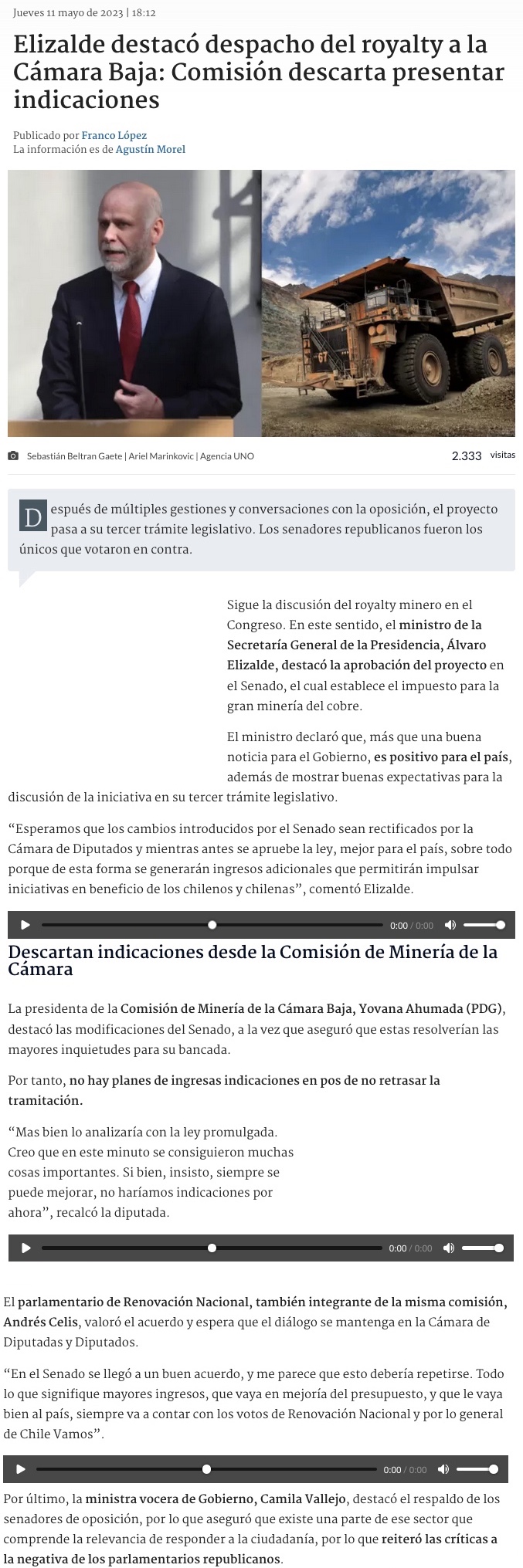 Prohens valora aprobación de royalty pero advierte: "Debemos cautelar que la minería siga creciendo" - (emol)