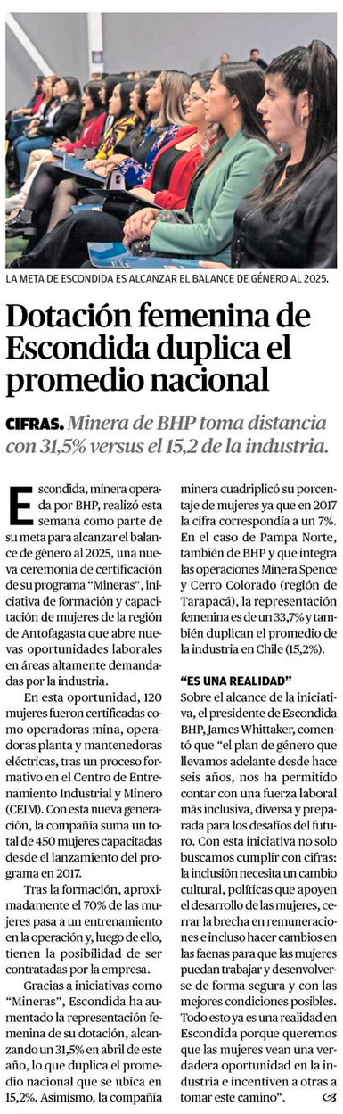 Dotación femenina de Escondida duplica el promedio nacional - (El Mercurio de Calama)