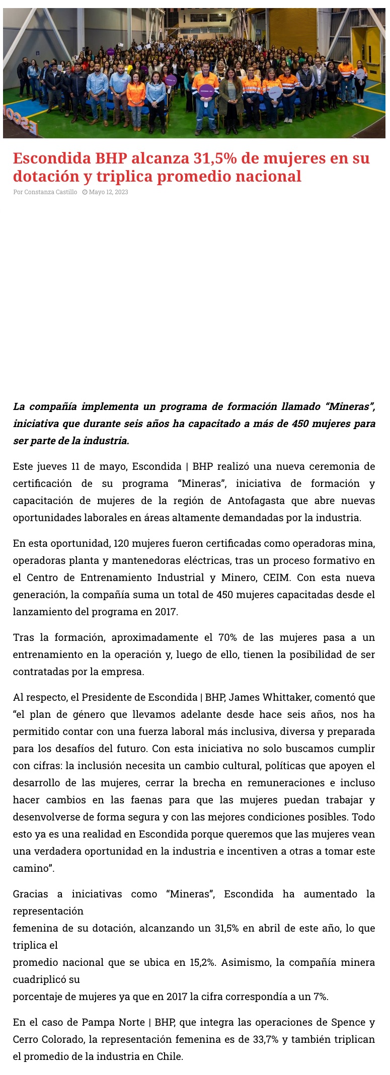 Escondida BHP alcanza 31,5% de mujeres en su dotación y triplica promedio nacional - (norteyenegia.cl)