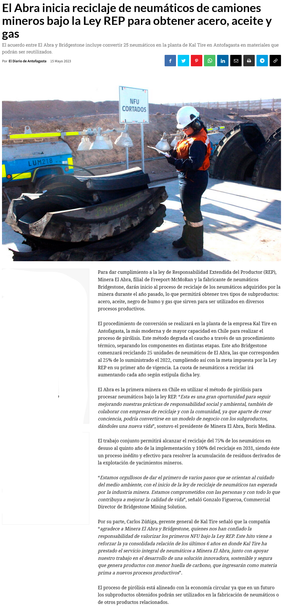 El Abra inicia reciclaje de neumáticos de camiones mineros bajo la Ley REP - (El Mercurio de Calama)