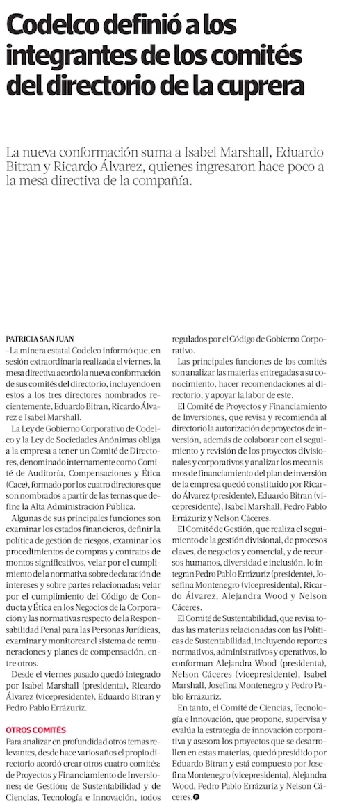 Estatal Codelco reorganiza los comités de su directorio - (El Mercurio de Santiago)