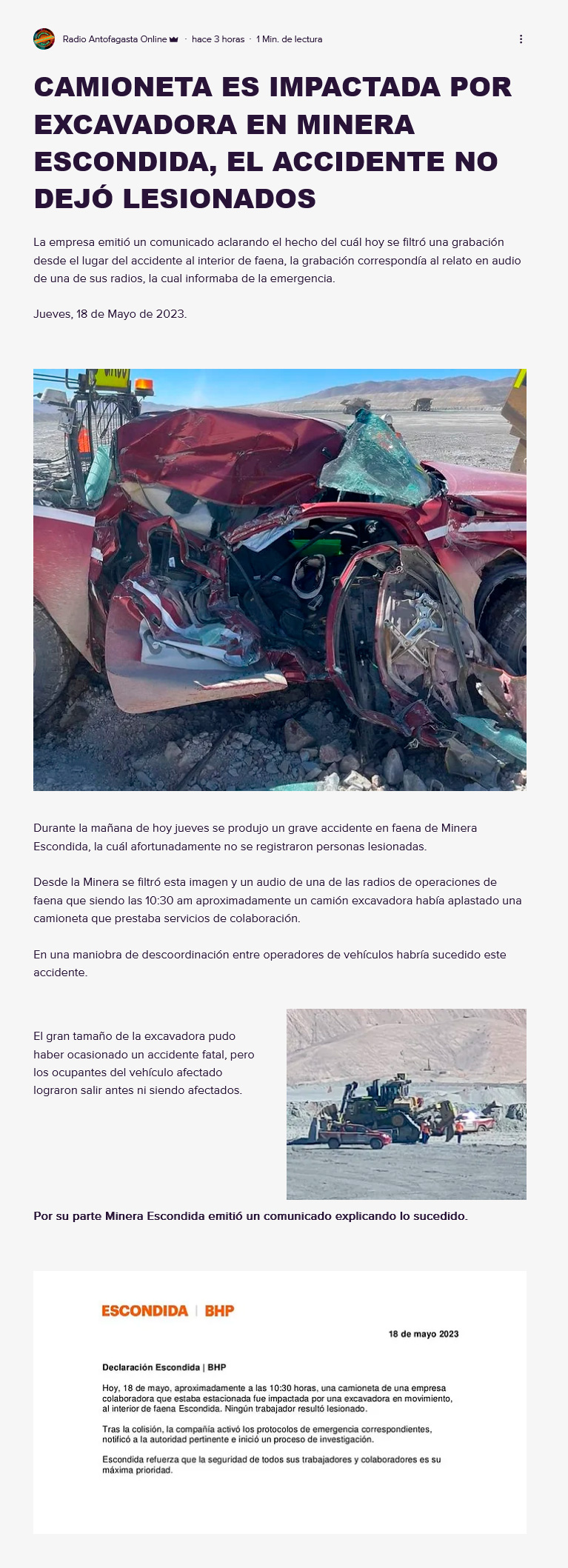 Máquina excavadora impactó a camioneta en Minera Escondida - (antofagasta.tv)